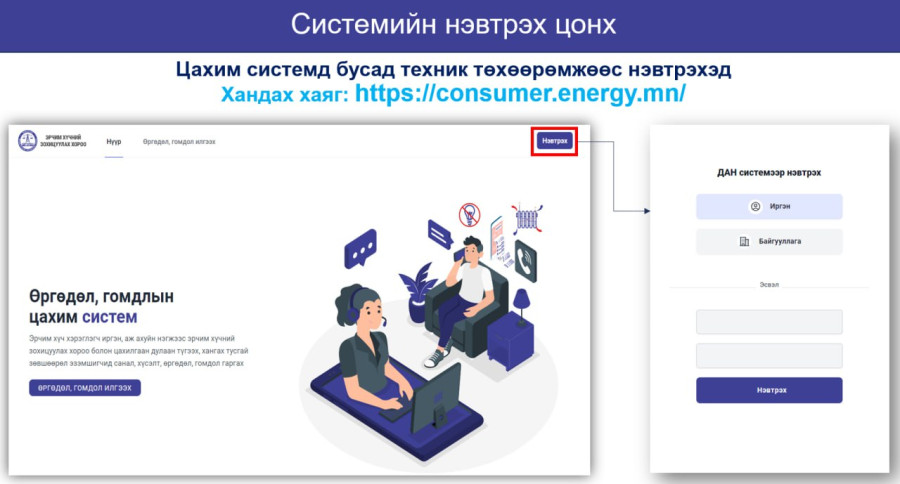 - Эрчим хүч хэрэглэгч иргэн, аж ахуйн нэгжээс Эрчим хүчний зохицуулах хороо болон цахилгаан, дулаан түгээх, хангах тусгай зөвшөөрөл эзэмшигчид санал, хүсэлт, өргөдөл, гомдол гаргахдаа https://consumer.energy.mn/ цахим системд хандаж гаргана уу. Мөн гар утасны econusmer аппликейшныг татаж суулган санал, хүсэлт, өргөдөл, гомдлоо гаргах боломжтой.