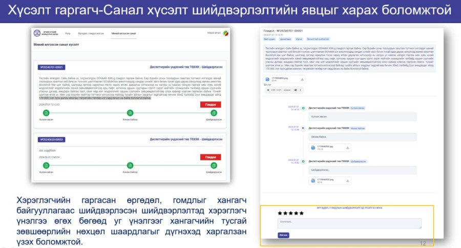 - Хэрэглэгчийн өргөдөл, гомдлыг Иргэдээс төрийн байгууллага, албан тушаалтанд гаргасан өргөдөл, гомдлыг шийдвэрлэх тухай хуульд заасны дагуу 30 хоногт багтаан шийдвэрлэнэ.