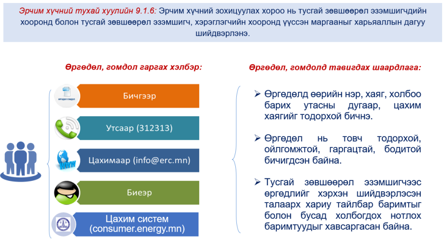 - Хэрэглэгчээс цахилгаан, дулаан үйлдвэрлэх, дамжуулах, түгээх, хангах ТЗЭ-д хандан, өргөдөл, гомдлоо гаргаж, хянан шийдвэрлүүлэх бөгөөд шийдвэрийг зөвшөөрөөгүй болон ТЗЭ-ээс хуульд заасан хугацаанд хариу өгөөгүй бол ЭХЗХ-нд хандана.